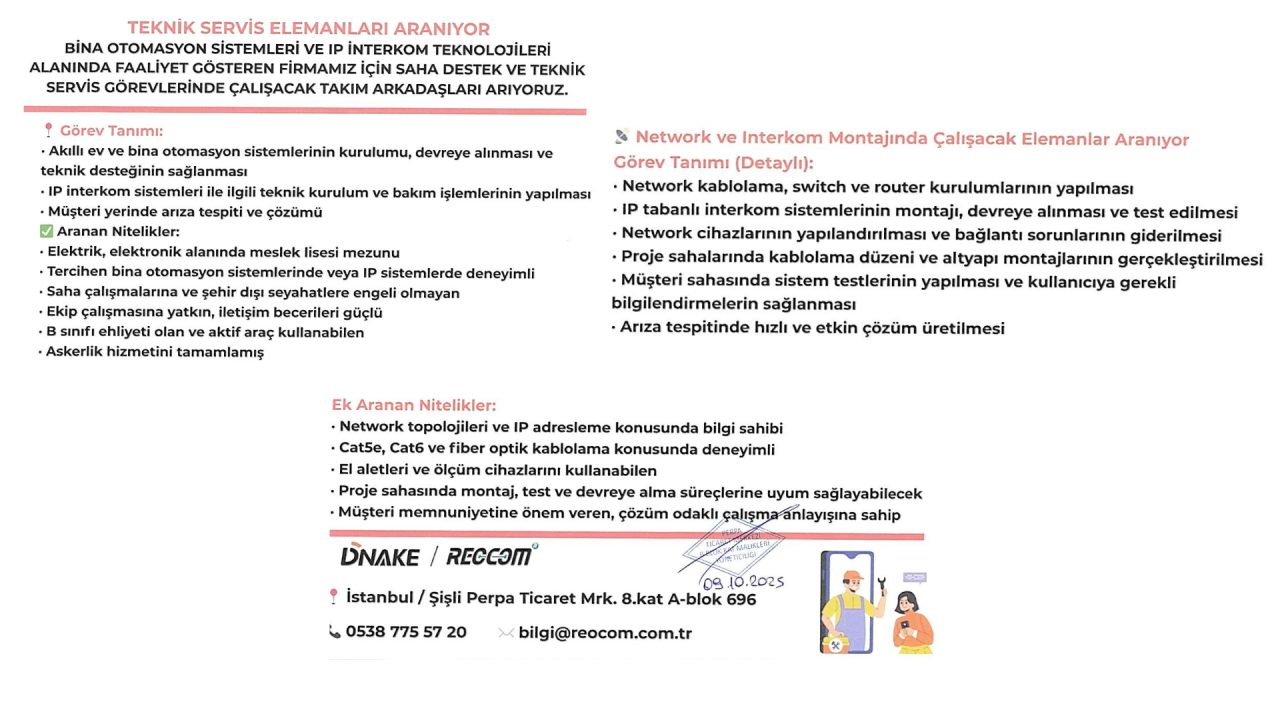 DNAKE / RECOM, bina otomasyon sistemleri ve IP interkom teknolojileri alanında faaliyet gösteren firmasında görevlendirilmek üzere teknik servis ve network montaj personelleri arıyor.