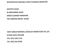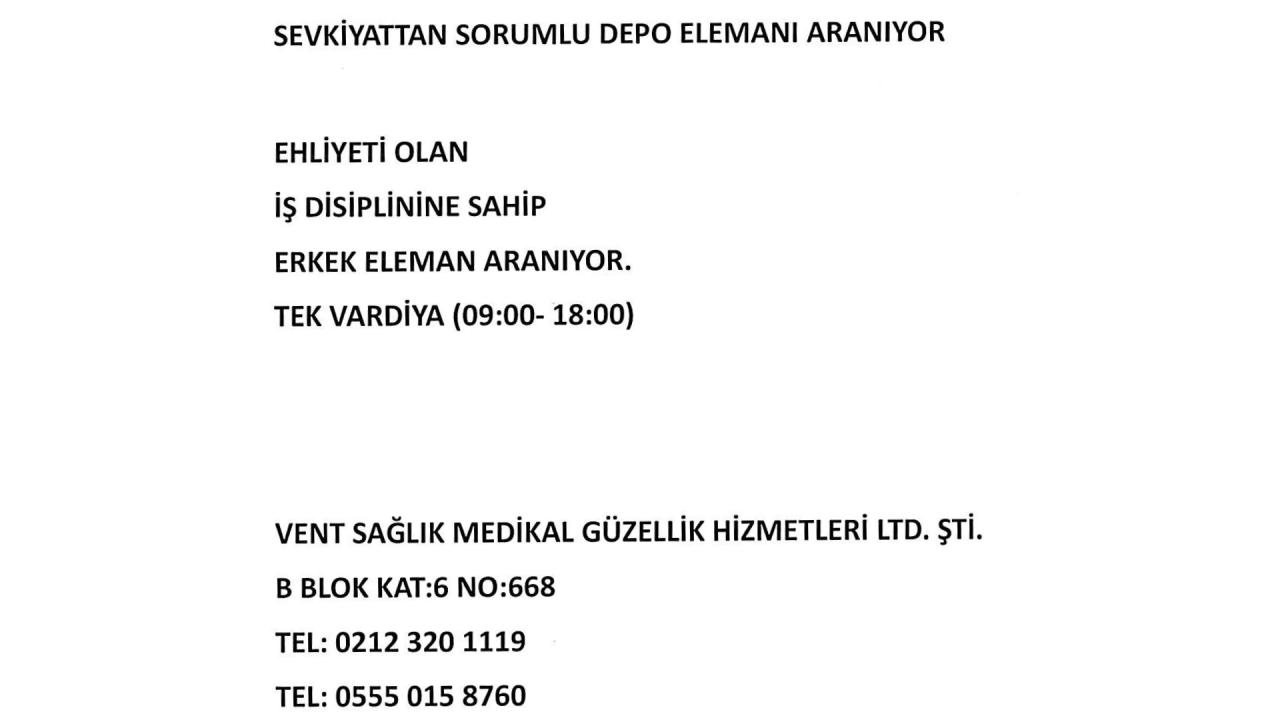 Vent Sağlık Medikal Güzellik Hizmetleri Ltd. Şti. bünyesinde, sevkiyattan sorumlu depo elemanı olarak görev alacak personel; günlük ürün sevkiyatlarını organize edecek ve depo düzenini sağlayacaktır. Çalışma tek vardiya şeklindedir (09:00–18:00).