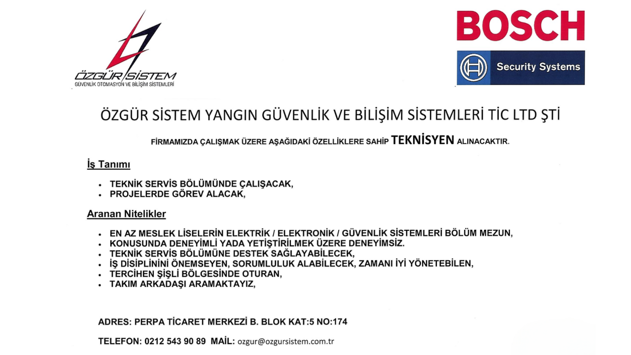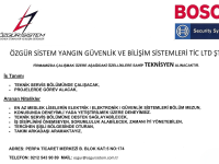 Özgür Sistem Yangın Güvenlik ve Bilişim Sistemleri Tic. Ltd. Şti., firmamızda çalışmak üzere aşağıdaki özelliklere sahip teknik personel alımı yapacaktır:
