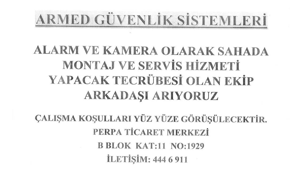 ALARM VE KAMERA OLARAK SAHADA MONTAJ VE SERVİS HİZMETİ YAPACAK TECRÜBESİ OLAN EKİP ARKADAŞI ARIYORUZ ÇALIŞMA KOŞULLARI YÜZ YÜZE GÖRÜŞÜLECEKTİR. PERPA TİCARET MERKEZİ