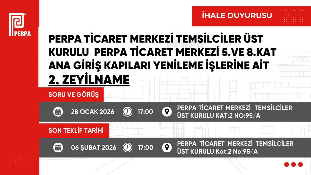 İhaleye teklifler 5 Aralık 2025 Salı günü saat 17:00’ye kadar Perpa Ticaret Merkezi Kat Malikleri Yöneticiliği Temsilciler Üst Kurulu Halil Rıfat Paşa Mah.Perpa Ticaret Merkezi, Kat:2 No:95/A Kapalı Otopark Merkezi Okmeydanı / Şişli / İstanbul adresindeki müdürlüğe imza karşılığı verilmiş olacaktır.