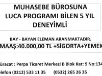 MUHASEBE BÜROSUNA LUCA PROGRAMI BİLEN 5 YIL DENEYİMLİ BAY - BAYAN ELEMAN ARANMAKTADIR. MAAŞ:40.000,00 TL +SİGORTA+YEMEK Müracat : Perpa Ticaret Merkezi B Blok Kat: 9 No:1342 Telefon (0212) 533 11 35 (0532) 265 26 35