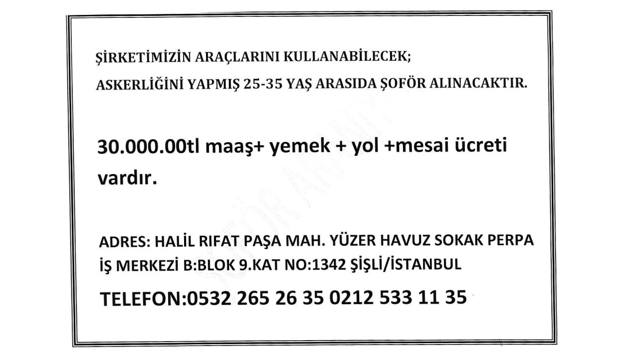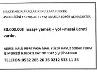 ASKERLİĞİNİ YAPMIŞ 25-35 YAŞ ARASIDA ŞOFÖR ALINACAKTIR.