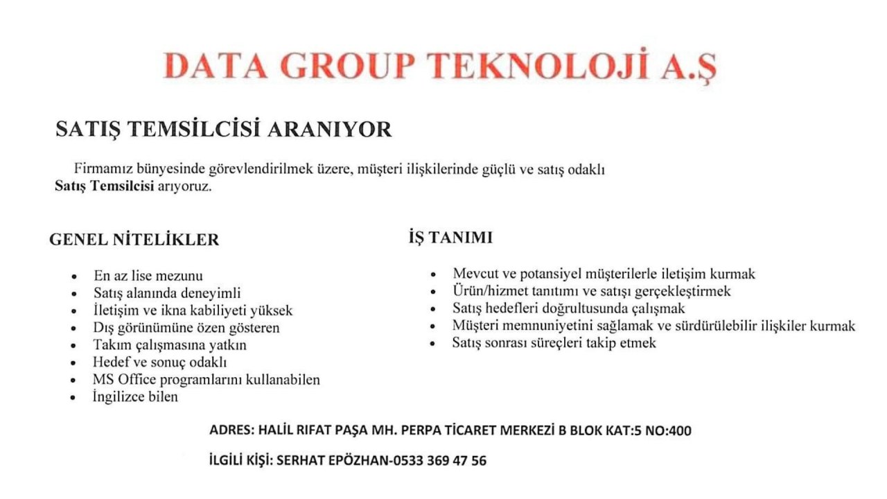 Satış Temsilcisi arıyoruz.
