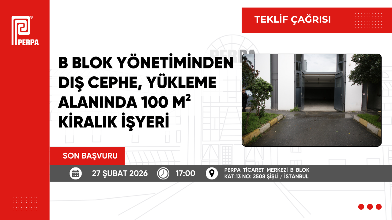 PERPA Ticaret Merkezi B Blok Yönetimi tarafından, dış cephede yükleme alanında bulunan yaklaşık 100 m² büyüklüğündeki işyeri için kiralama amaçlı teklif çağrısı başlatılmıştır.