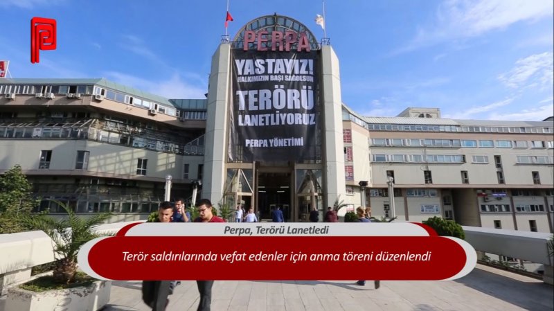 Perpa Yönetimi gün içinde Perpa girişine “Yastayız. Halkımızın Başı Sağ olsun. Terörü Lanetliyoruz” bayrağı astı.